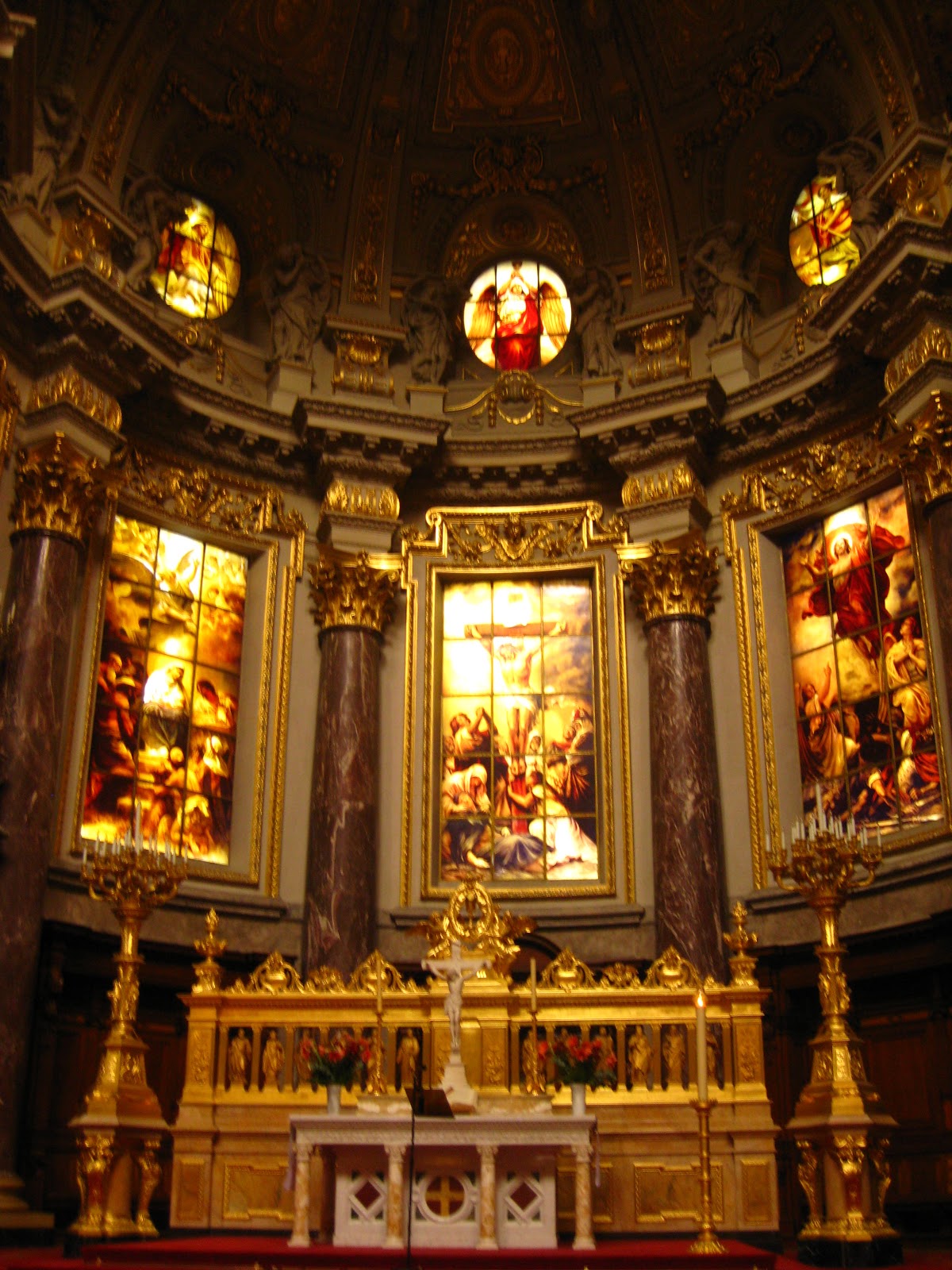 The dome on top was hit by an aerial bomb during the end of the war. Originally, the dome was much higher, but was scaled down during the restoration. Many of Berlin's buildings had a similar heavy, dark feeling that you can see in this church.